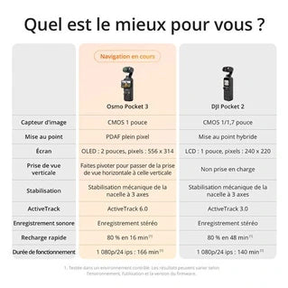 Le Pocket 3 est doté d’un puissant capteur CMOS de 1 pouce produisant des images ultra-détaillées à portée de main. L’écran tactile rotatif de 2 pouces et la mise au point rapide sur l’ensemble des pixels facilitent le passage à l’horizontale ou à la verticale pour une connaissance et un contrôle plus précis. Avec une résolution de 4K/120 ips, une stabilisation mécanique à trois axes et une multitude de fonctions intelligentes, Pocket 3 saura répondre à vos moindres